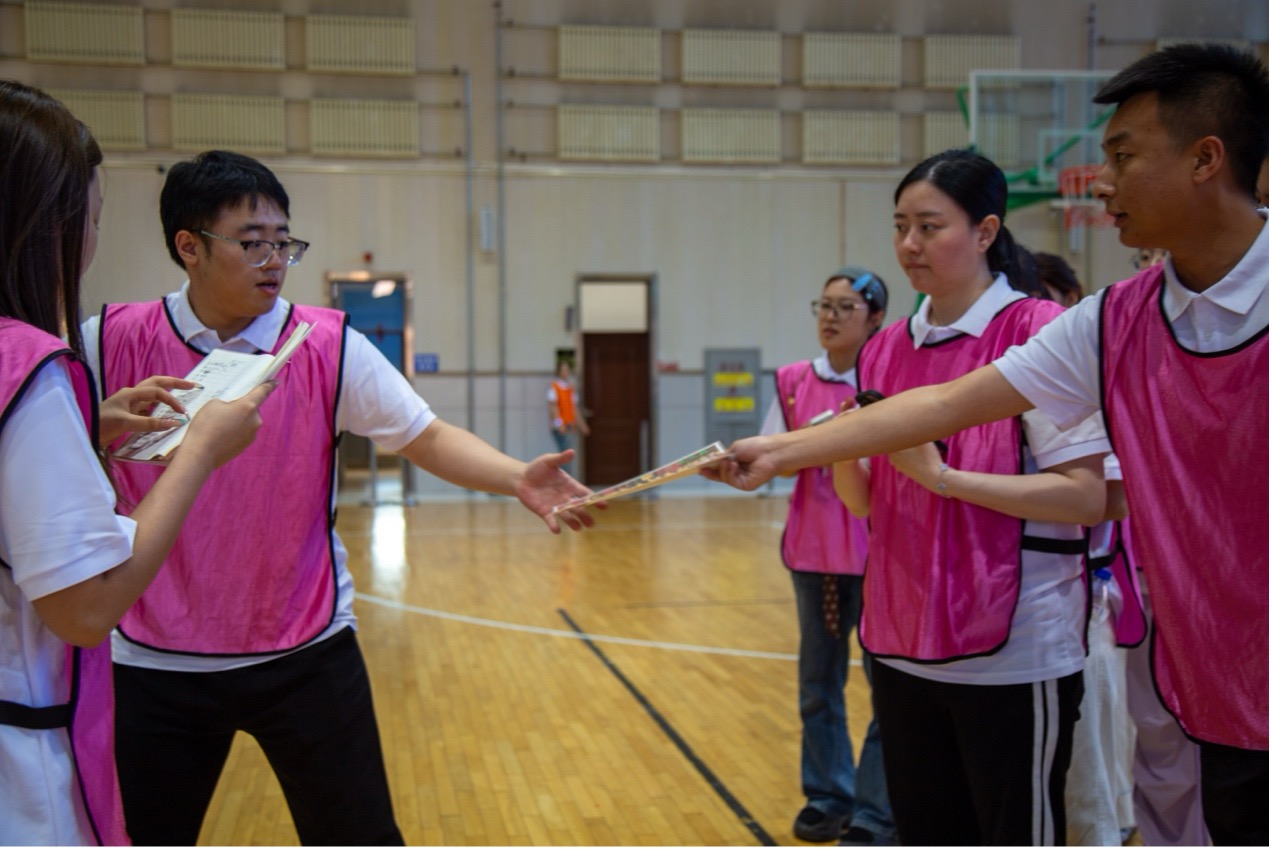 活动以“破冰与团队建设”拉开序幕,全体学员分成四队,整齐列队,伴随着激情四溢、欢快动感的音乐进行热身。随后,各队通过民主决议,选出了“队长”“助理”“旗手”等团队核心成员。在队长的带领下,各队迅速统一思想,明确任务分工,强调团队协作,注重执行效率,全员参与,集思广益,积极推进团队文化建设。在欢快的乐曲伴奏下,“前途无量队”“炸雷队”“飞鹰队”“干啥都对队”依次展示了各自的队名、口号和队歌,现场气氛热烈非凡。