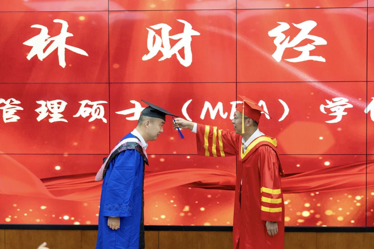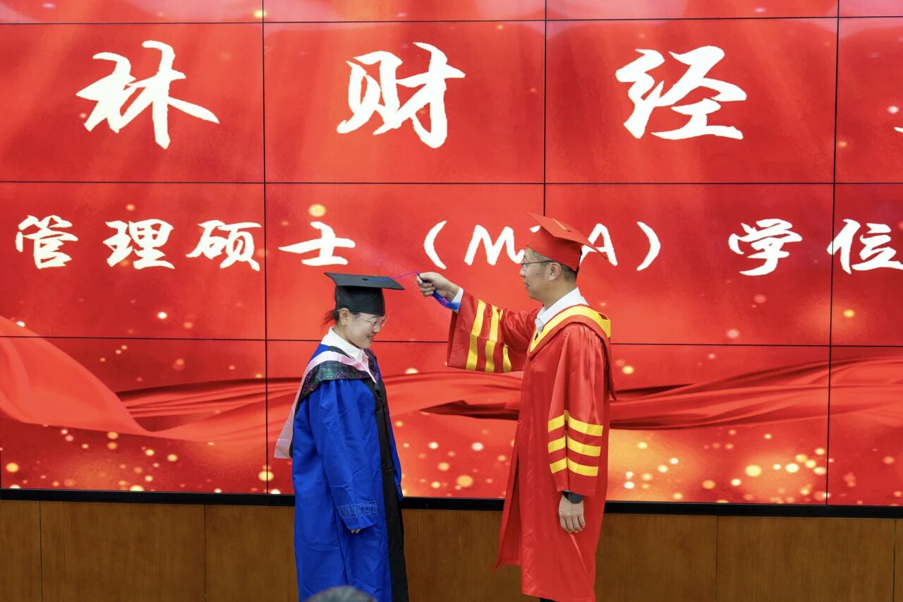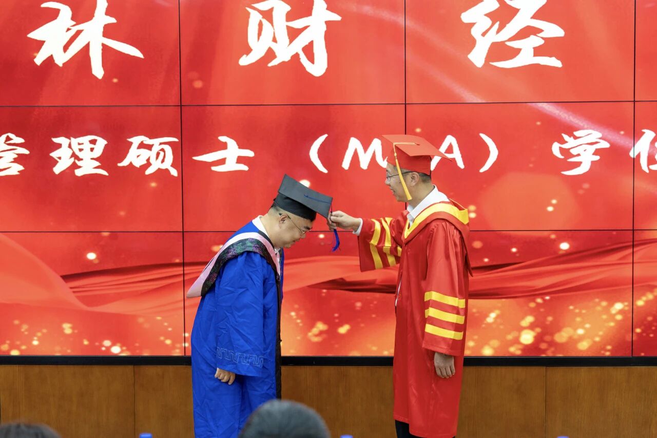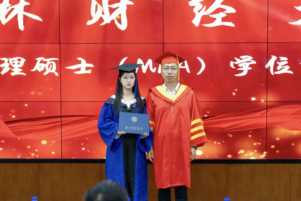 接下来,举行了隆重的学位授予仪式。2025届MBA毕业生身着硕士服,满怀喜悦依次上台,祝国平为他们拨正流苏,并颁发毕业证书。